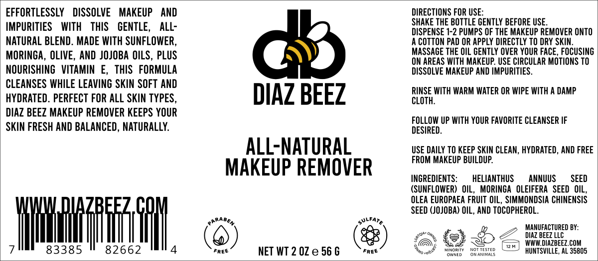 Remove makeup naturally and nourish your skin with Diaz Beez All-Natural Makeup Remover. Packed with skin-loving ingredients like Sunflower, Moringa, Olive, and Vitamin E oil.